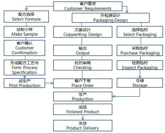 配方研發、包材原料采購(gòu)、VI設計、産品灌裝、産品送檢、三證提供的(de)全過程。
